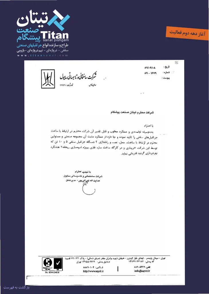 ![]() | شرکت نور ایستا پلاستیک | چهاردستگاه جرثقیل سقفی | ![]() |